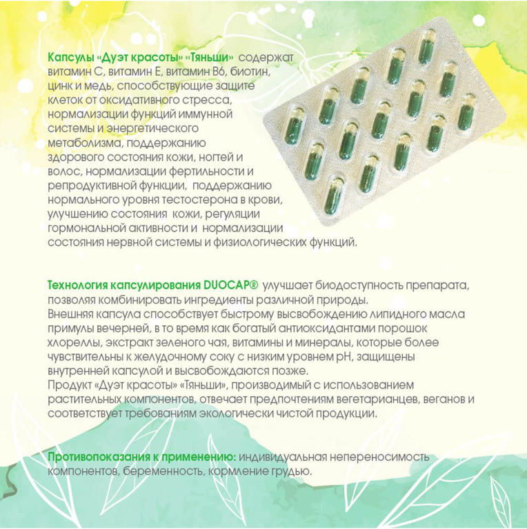Капсулы «Дуэт красоты» идеально подойдут всем, кто хочет оставаться молодыми, красивыми и здоровыми. Они рекомендованы для поддержания стройной фигуры и сохранения здоровья кожи и волос. В основе их работы концепция тройного действия: детоксикация, питание и защита.