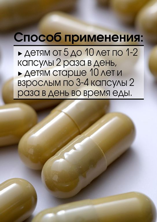 – детям старше 10 лет и взрослым по 3–4 капсулы 2 раза в день во время еды