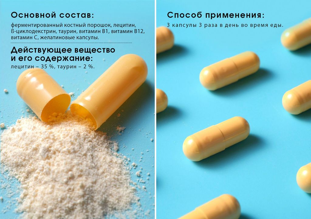 Лецитин, кальция карбонат, микрокристаллическая целлюлоза, порошок костного кальция, кукурузный крахмал, таурин, витамин С, фолиевая кислота, витамины В1, В12.
