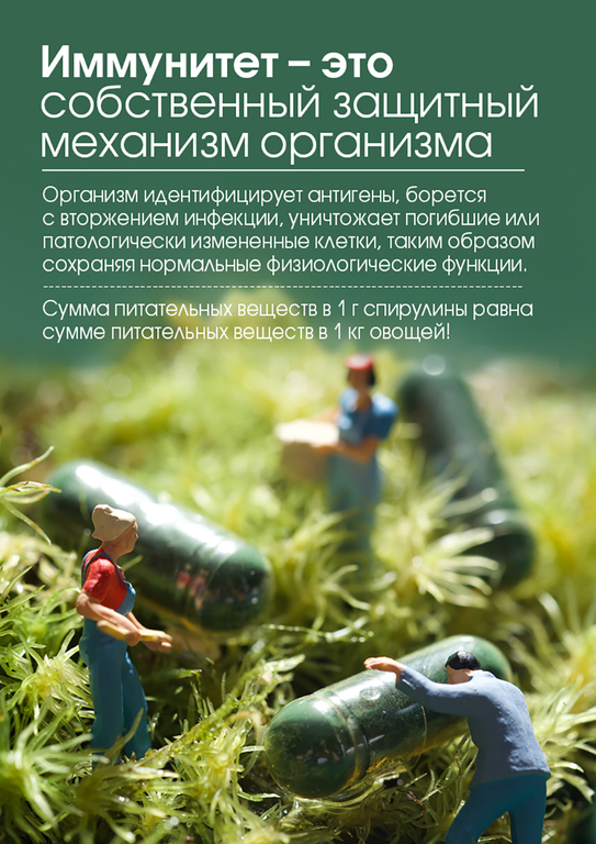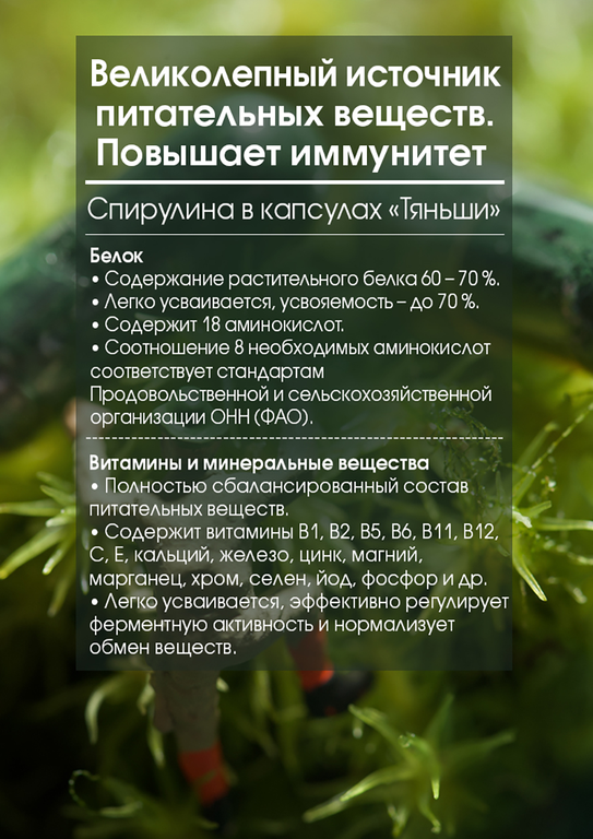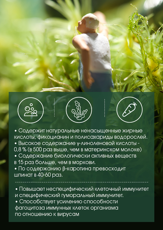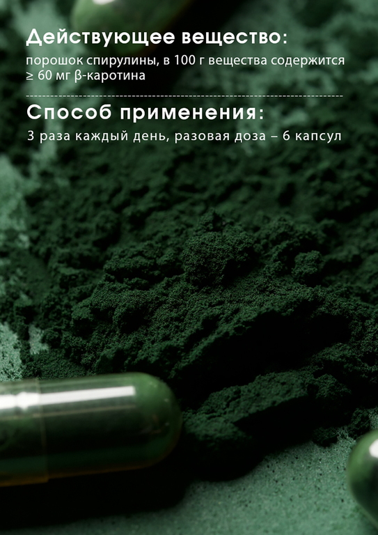 Спирулина – это сине-зеленая водоросль, богатая белком и бета-каротином. Она также содержит тщательно сбалансированный самой природой набор витаминов группы В и ряд важных для организма микроэлементов и аминокислот.